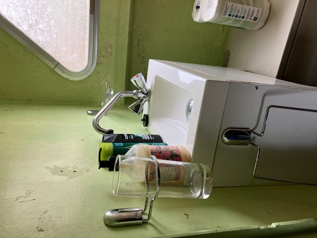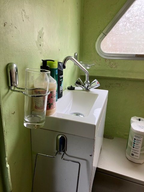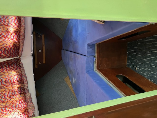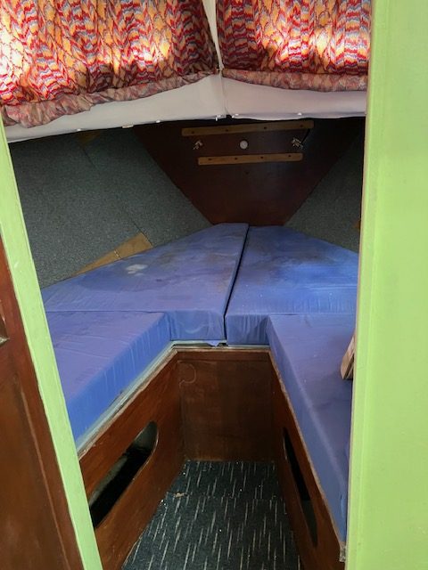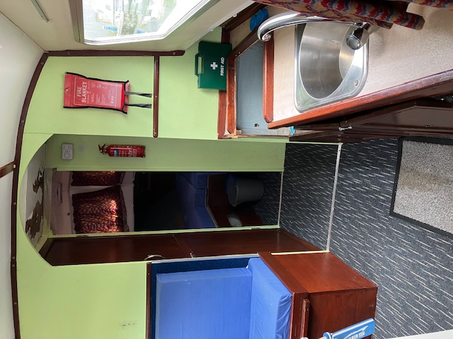 2 + 2 Berth accommodation, cubicle for a portaloo, hanging space, galley with room for a portable gas stove, sink/drainer & storage below.